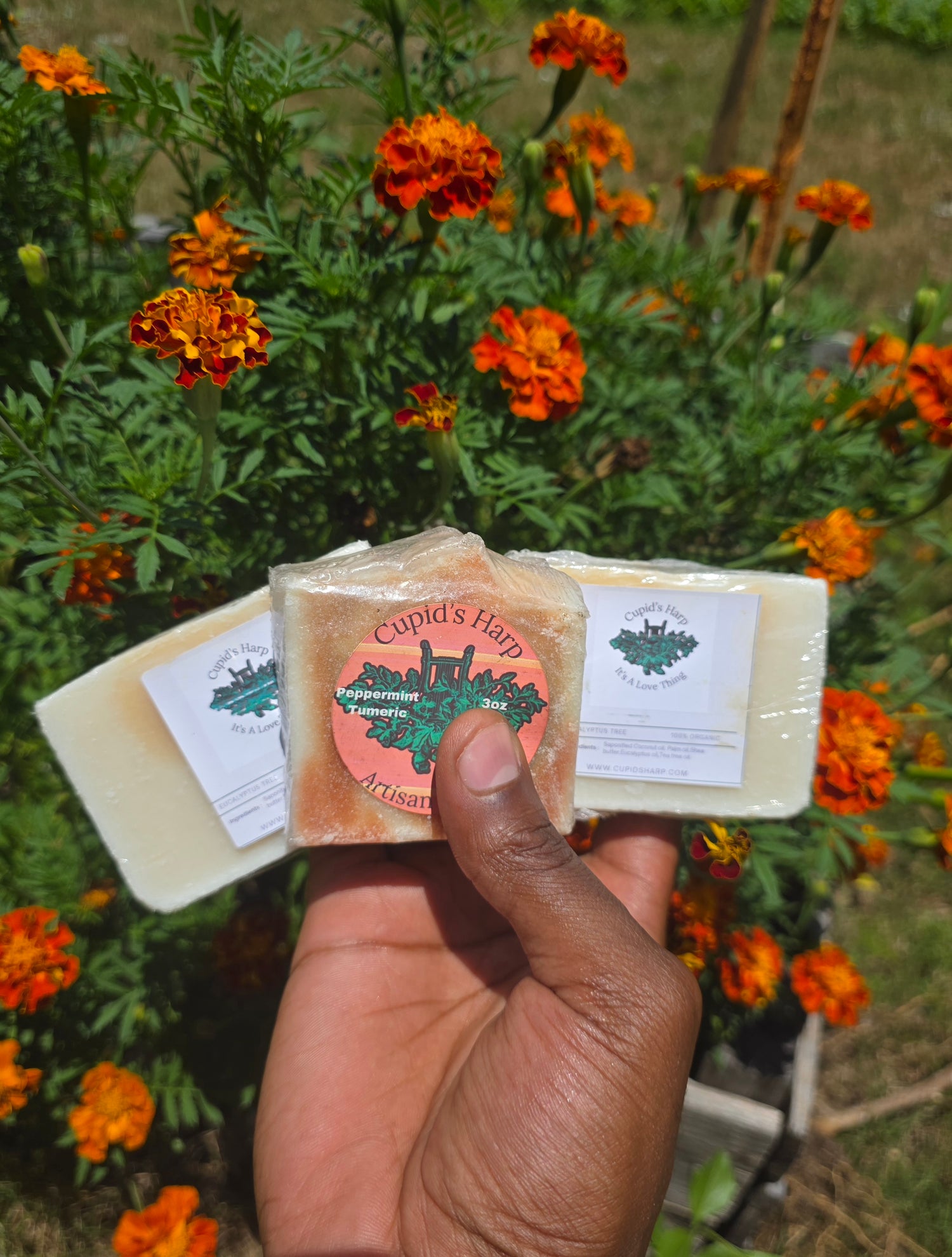Infused with cooling peppermint and the earthy goodness of turmeric, this soap invigorates your skin and awakens your senses. Peppermint provides a refreshing tingle and natural antibacterial properties, while turmeric brings a warm glow and supports healthy-looking skin.
